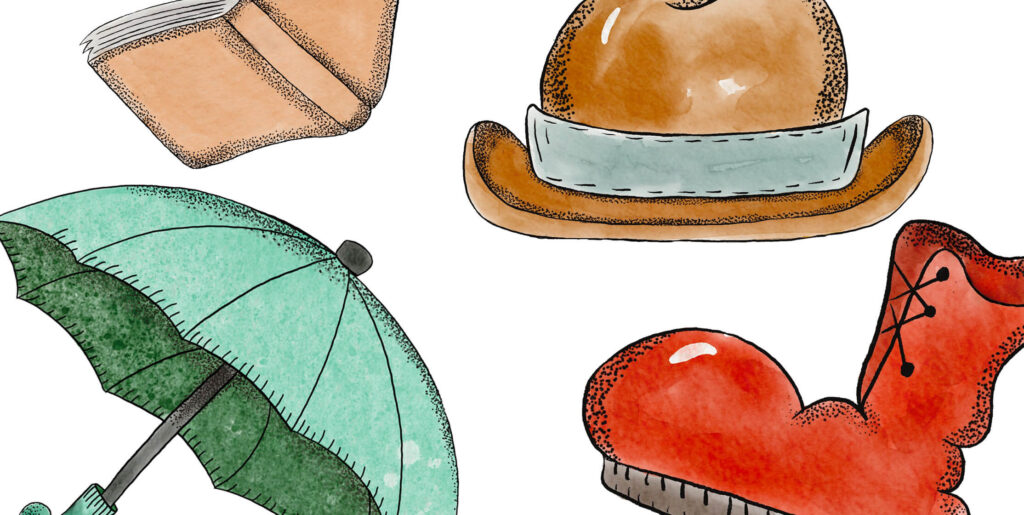 Two quirky birds, a splash of watercolor, and a breeze of fall whimsy. A playful display of characters in motion—boots, books, and a blustery day.